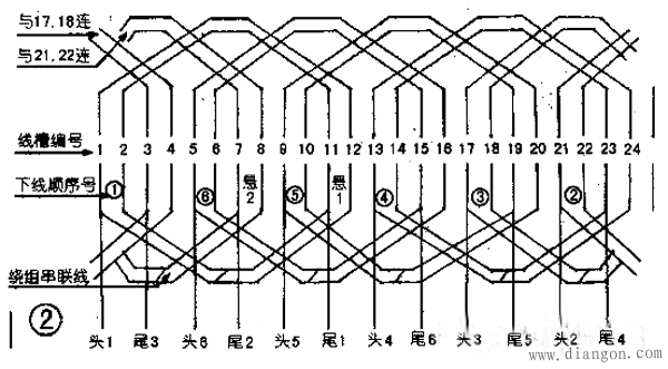 先取下第一個同心式繞組兩槽。然后空兩槽取下第二個繞組兩槽。注意這兩組線圈都只取下一個有效邊。取完后把這兩組未入槽的4個有效邊,用絕緣紙包好懸置。然后空兩槽下第三組,這時繞組的兩個有效邊都要下入線槽。照此方法下好第四、第五個繞組。取下第六個繞組時,需將第一、第二繞組懸置部分朝相反方向翻轉(zhuǎn),顯露出第六個繞組的線槽,將第六個繞組取完,最后依次取好第一、第二繞組的懸置的有效邊(見圖2)。