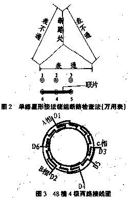用兆歐表檢查電動機(jī)斷路:單路三角形接法的按如圖1所示;單路星形接法的如圖2所示;電動機(jī)A相出線為1、4;B相出線為2、5;C相出線為3、6,特別注意在測量時(shí)應(yīng)把聯(lián)片取開。