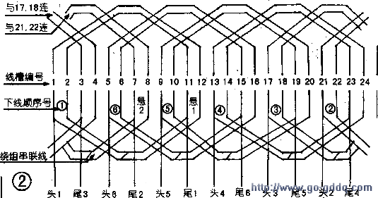 先取下第一個(gè)同心式繞組兩槽。然后空兩槽取下第二個(gè)繞組兩槽。注意這兩組線(xiàn)圈都只取下一個(gè)有效邊。取完后把這兩組未入槽的4個(gè)有效邊,用絕緣紙包好懸置。然后空兩槽下第三組,這時(shí)繞組的兩個(gè)有效邊都要下入線(xiàn)槽。照此方法下好第四、第五個(gè)繞組。取下第六個(gè)繞組時(shí),需將第一、第二繞組懸置部分朝相反方向翻轉(zhuǎn),顯露出第六個(gè)繞組的線(xiàn)槽,將第六個(gè)繞組取完,最后依次取好第一、第二繞組的懸置的有效邊(見(jiàn)圖2)。
