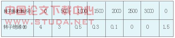 4.1前幾年,我廠接連出現(xiàn)發(fā)電機(jī)轉(zhuǎn)子絕緣降低,嚴(yán)重影響了發(fā)電機(jī)的正常運(yùn)行。發(fā)電機(jī)轉(zhuǎn)子的正負(fù)極對(duì)地最高電壓達(dá)到180-200伏,針對(duì)出現(xiàn)的這種問題,我們采取了除拔護(hù)環(huán)之外的所有方法,但效果都不明顯,并且出現(xiàn)了一種異常現(xiàn)象,也就是在冷態(tài)情況下轉(zhuǎn)子絕緣合格,在熱態(tài)情況絕緣下降,并網(wǎng)后,出現(xiàn)絕緣不合格。我們?cè)?號(hào)發(fā)電機(jī)上做試驗(yàn),從冷態(tài)到額定轉(zhuǎn)速3000轉(zhuǎn)/分,出現(xiàn)下列數(shù)據(jù):
