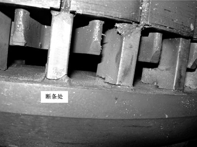 [$page] 根據(jù)以上分析,決定對(duì)電動(dòng)機(jī)解體檢查,轉(zhuǎn)子抽出后發(fā)現(xiàn)轉(zhuǎn)子耦合器端存在局部過(guò)熱現(xiàn)象(圖2),耦合器端綁扎端部籠條玻璃絲布有鼓包現(xiàn)象,打開(kāi)玻璃絲布再進(jìn)一步檢查。發(fā)現(xiàn)耦合器端47根籠條中就有32根斷裂或脫焊(圖3),前置泵端也有20多根斷裂。